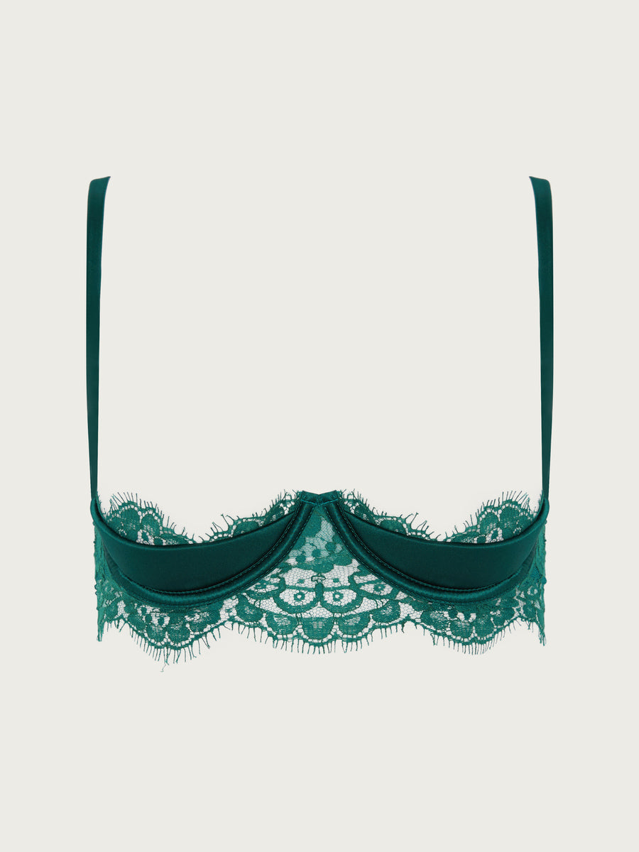 Delicate floral Leaver's lace and buttery soft silk have been crafted in a rich teal hue, creating the perfect frame for natural sensuality.