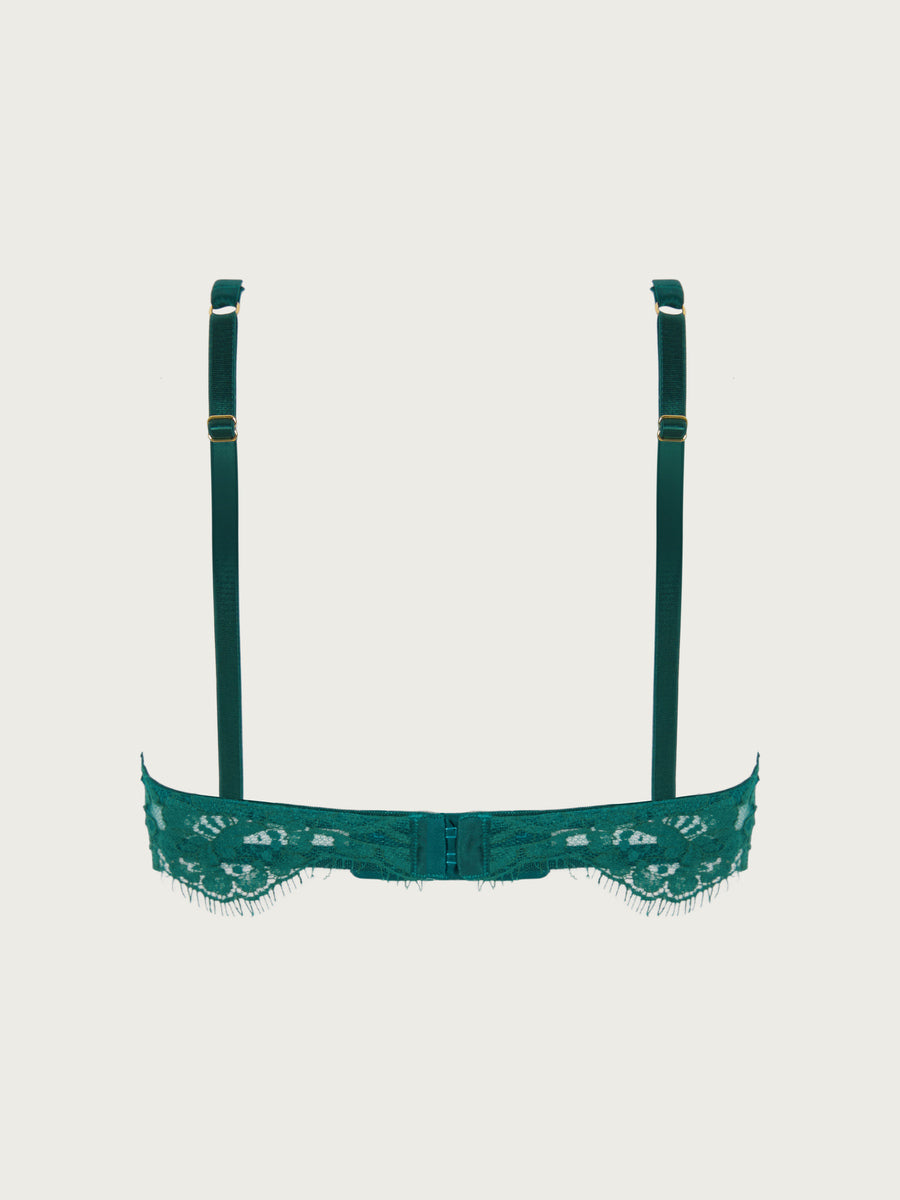The quarter cups are composed of silk-covered crescents which lift and support the décolletage, framed by whispers of delicate teal Leaver's lace which wrap around the back. The piece is completed with adjustable silk straps, fastened with a golden hook and eye at the centre back.