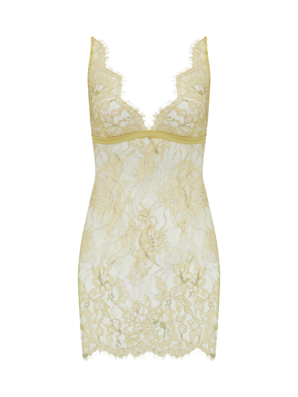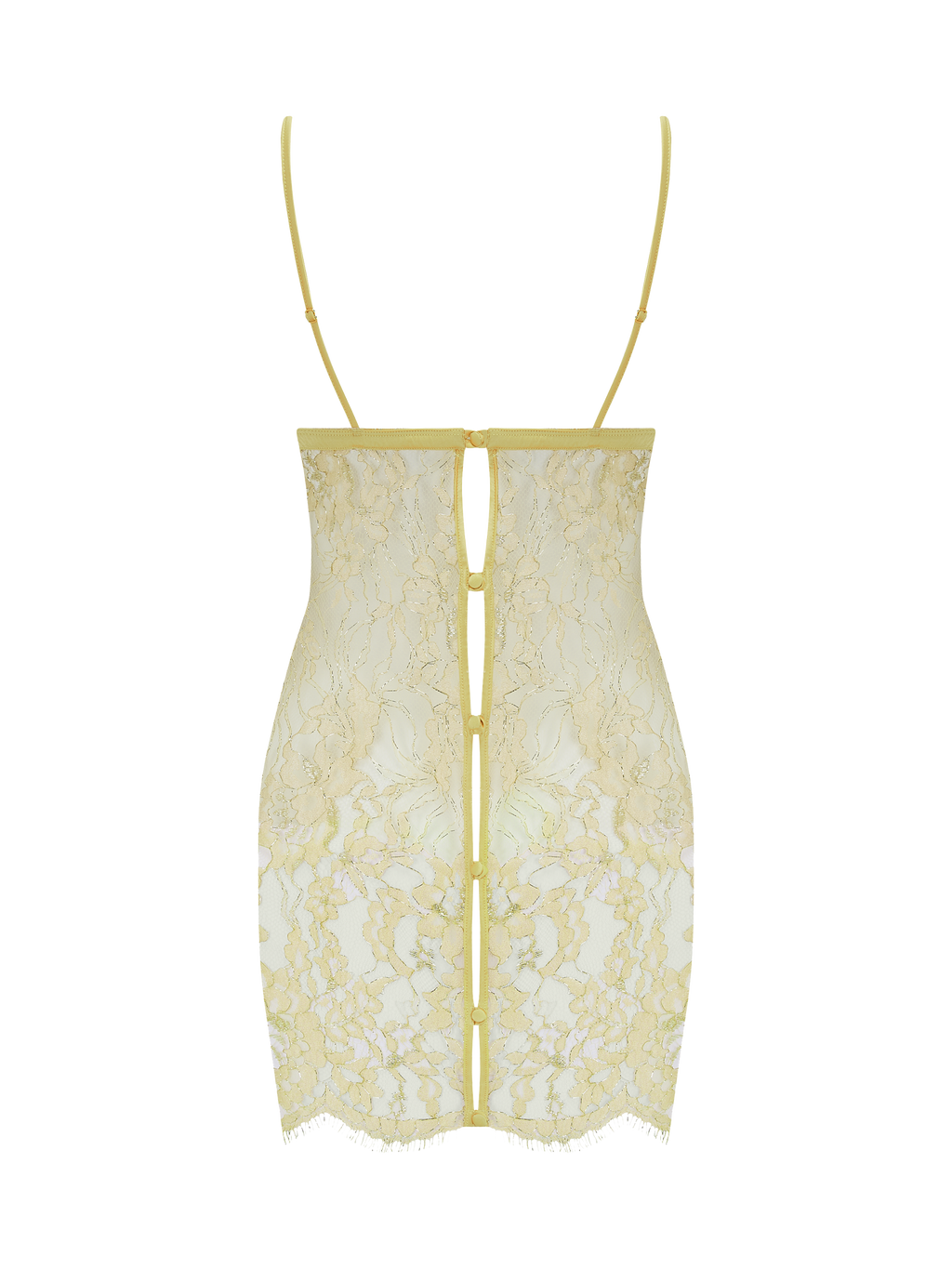 The body of this Slip is a vision of luxurious golden lace, finished with a scalloped eyelash trim along the hem. The piece closes to the rear with six silk buttons down the spine, fastening - or unfastening - the Slip in the most unforgettable way.