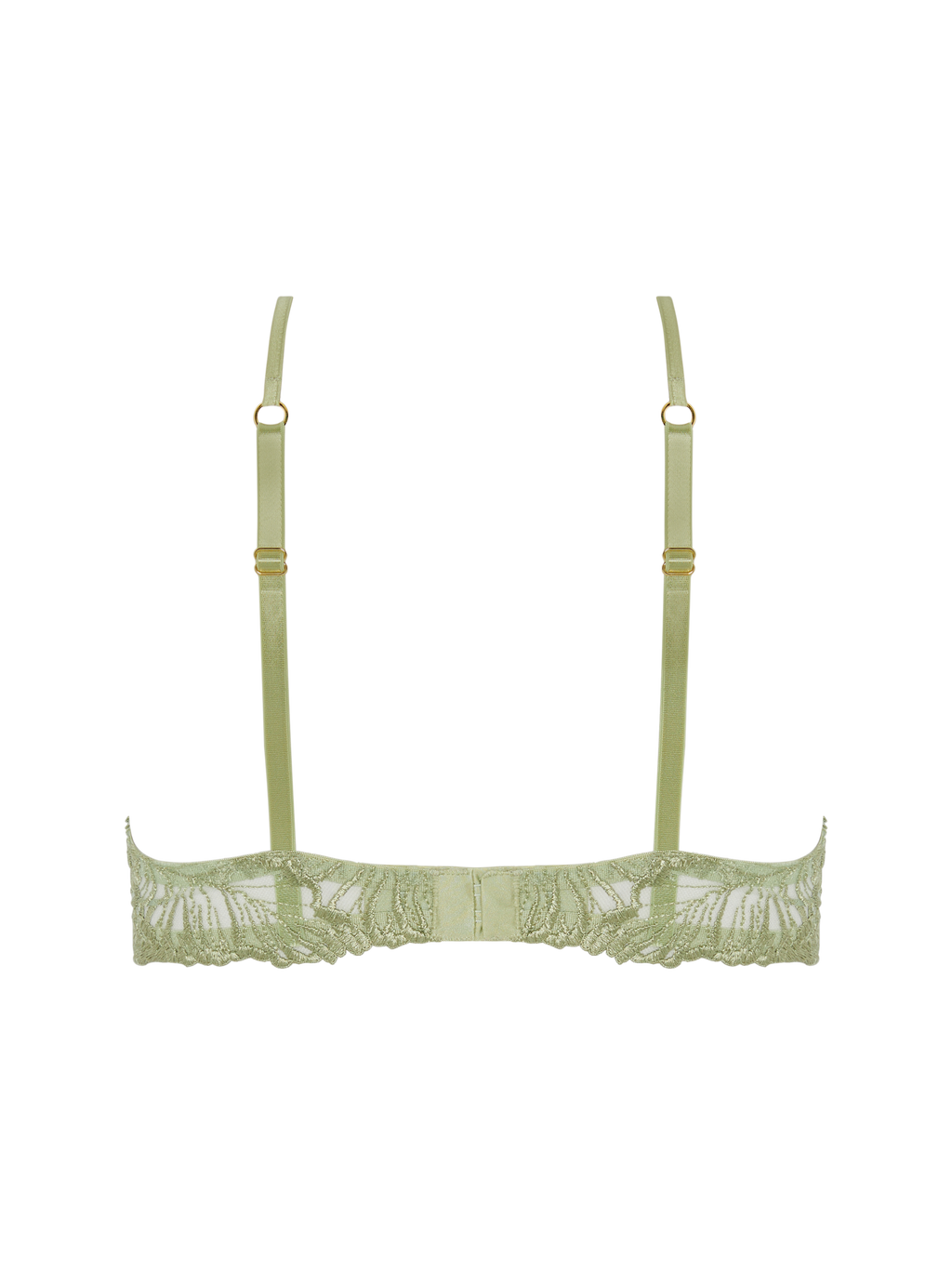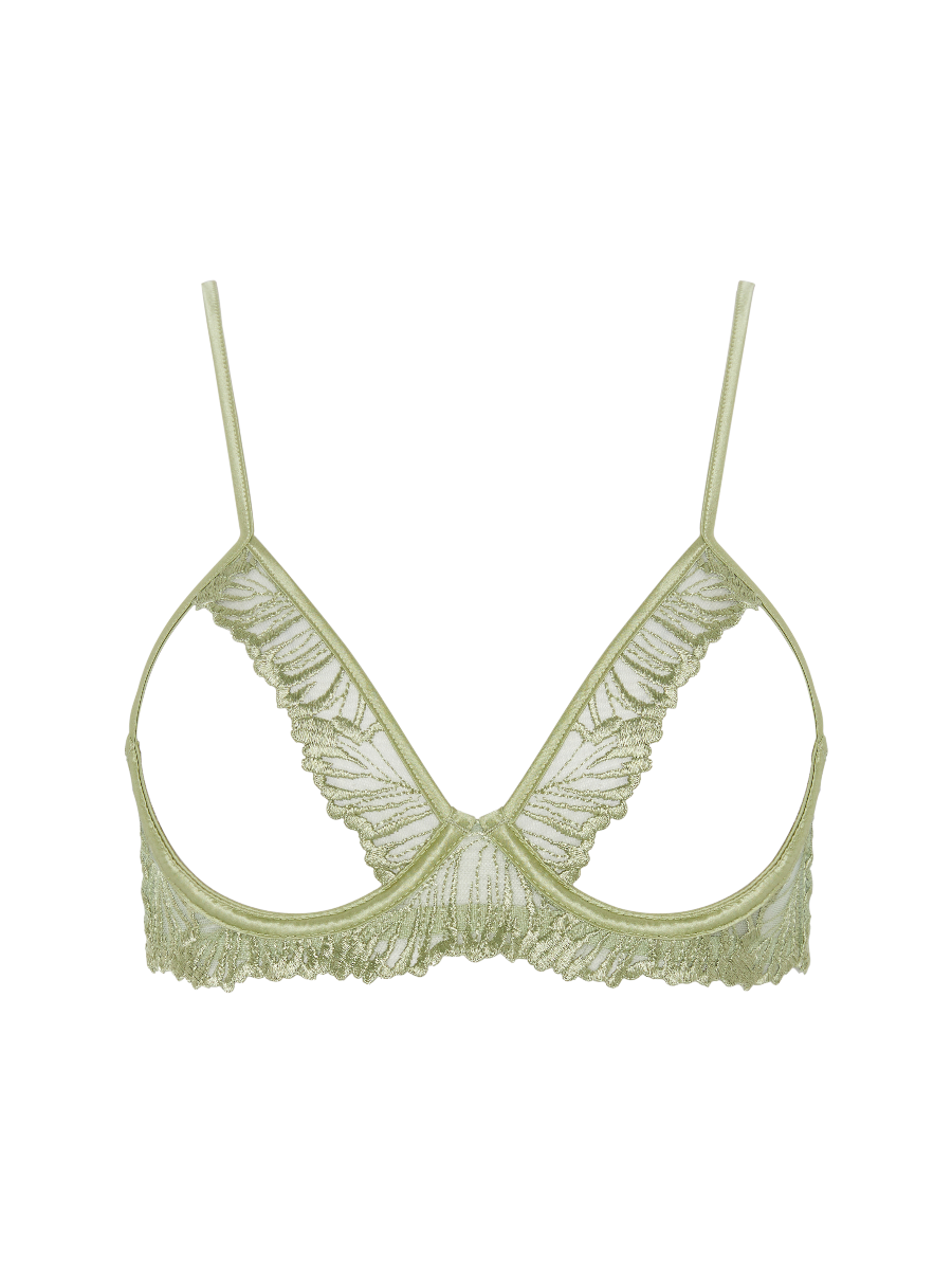 Soft silk straps encircle the bust with soft precision, while delicate scalloped edges guide the gaze with elegant intent to the décolletage, tracing the contours of the bust in an open silhouette. Luminous pistachio enhances the delicate detailing with fitting radiance. The open design balances bold exposure with sculpted contouring, inviting touch and admiration with a sensuous, deliberate grace and celebrating the body in its most intimate, artful form.