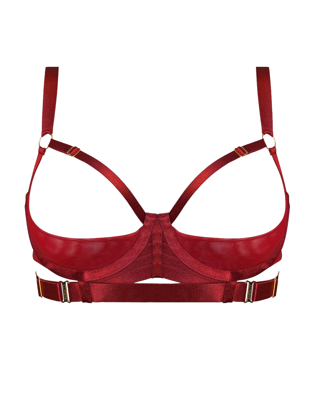 This underwired ouvert bra features soft mesh quarter cups for gentle support, detailed elastic panelling at the centre front, adjustable bust straps, and oversized 24k gold-plated 'O' rings, creating a striking bondage aesthetic.