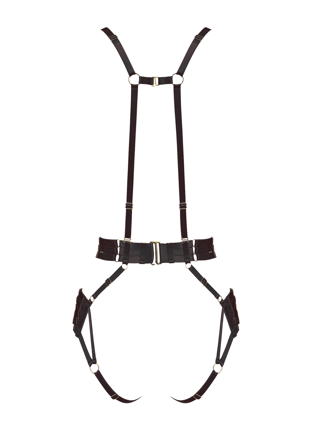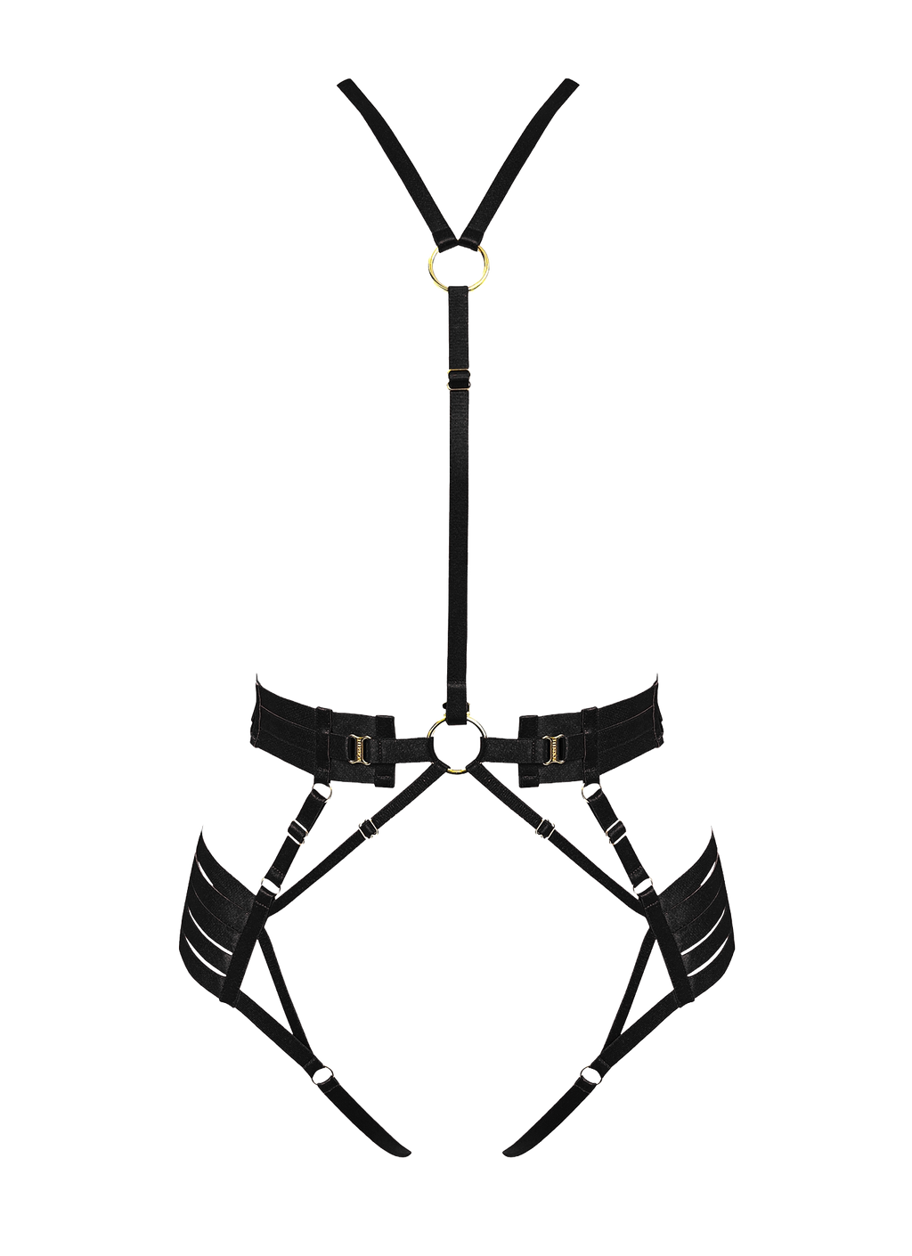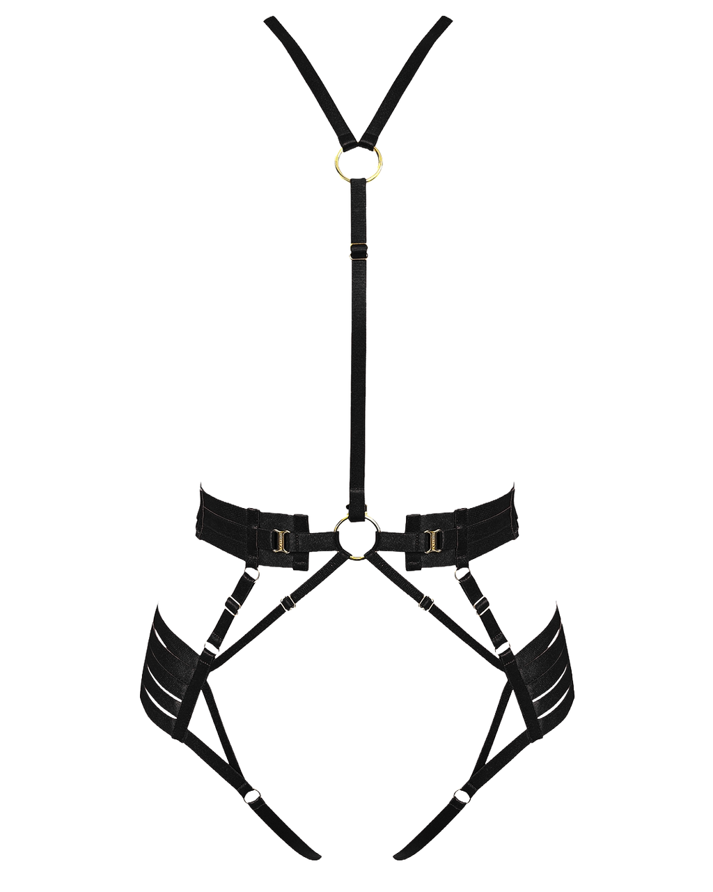 The Bordelle Signature Strap Body Harness in Black is a daring statement piece.