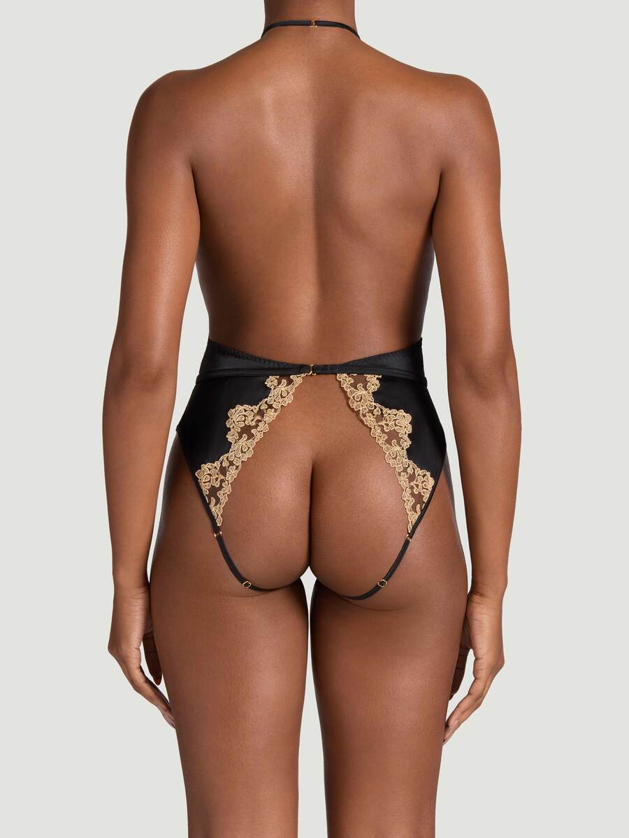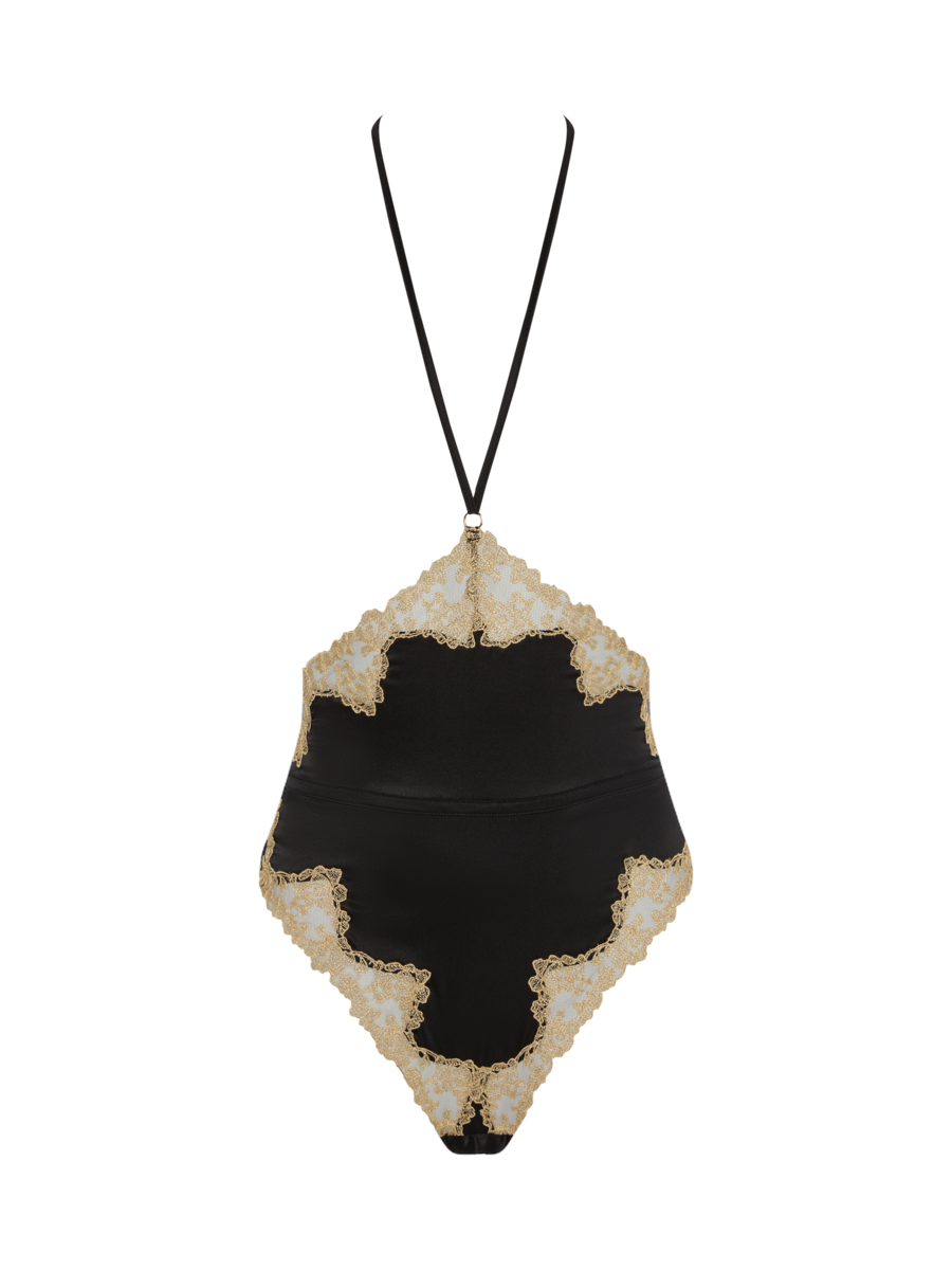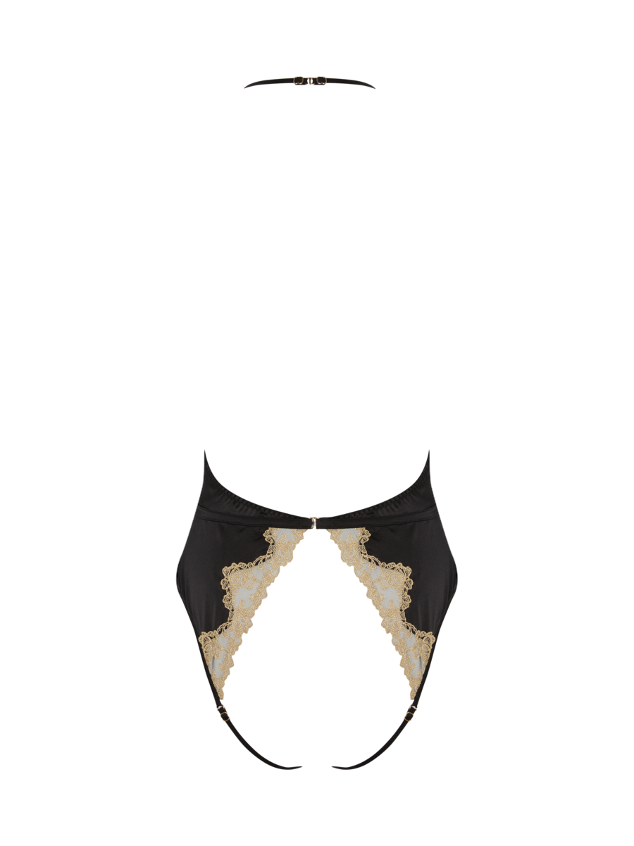 Slim jet black silk straps meet between the breasts and reach over the shoulders, while the scalloped embroidery and divine silk panels wrap around the torso, feeling as phenomenal as it looks. The delicacy of the piece is complemented by a silk covered waistband to cinch the waist, before moving into a silk-bound open knicker design. Across the rear, the cheeks are framed by the ornate scalloped embroidery. The piece is completed with adjustable silk straps, delicate golden hardware and an adjustable swan hook at the small of the spine.