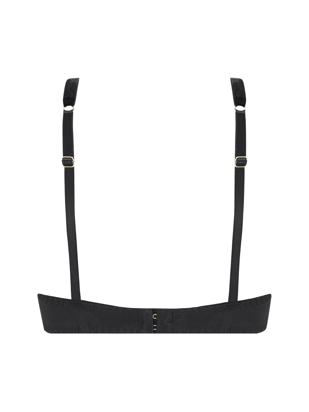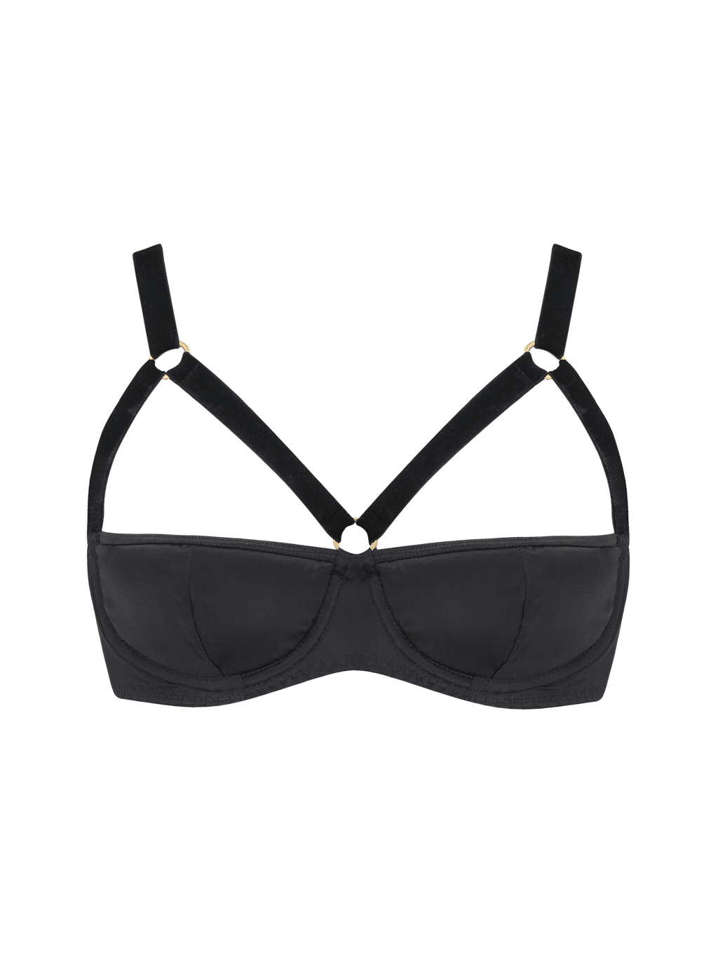 Assume a commanding new persona in the Persephone Half Cup Bra, a contemporary take on the bondage aesthetic. Velvet straps rise from linear silk half cups to form a cleavage-framing apex and a full bust, finished with shimmering metallic O-ring embellishments.