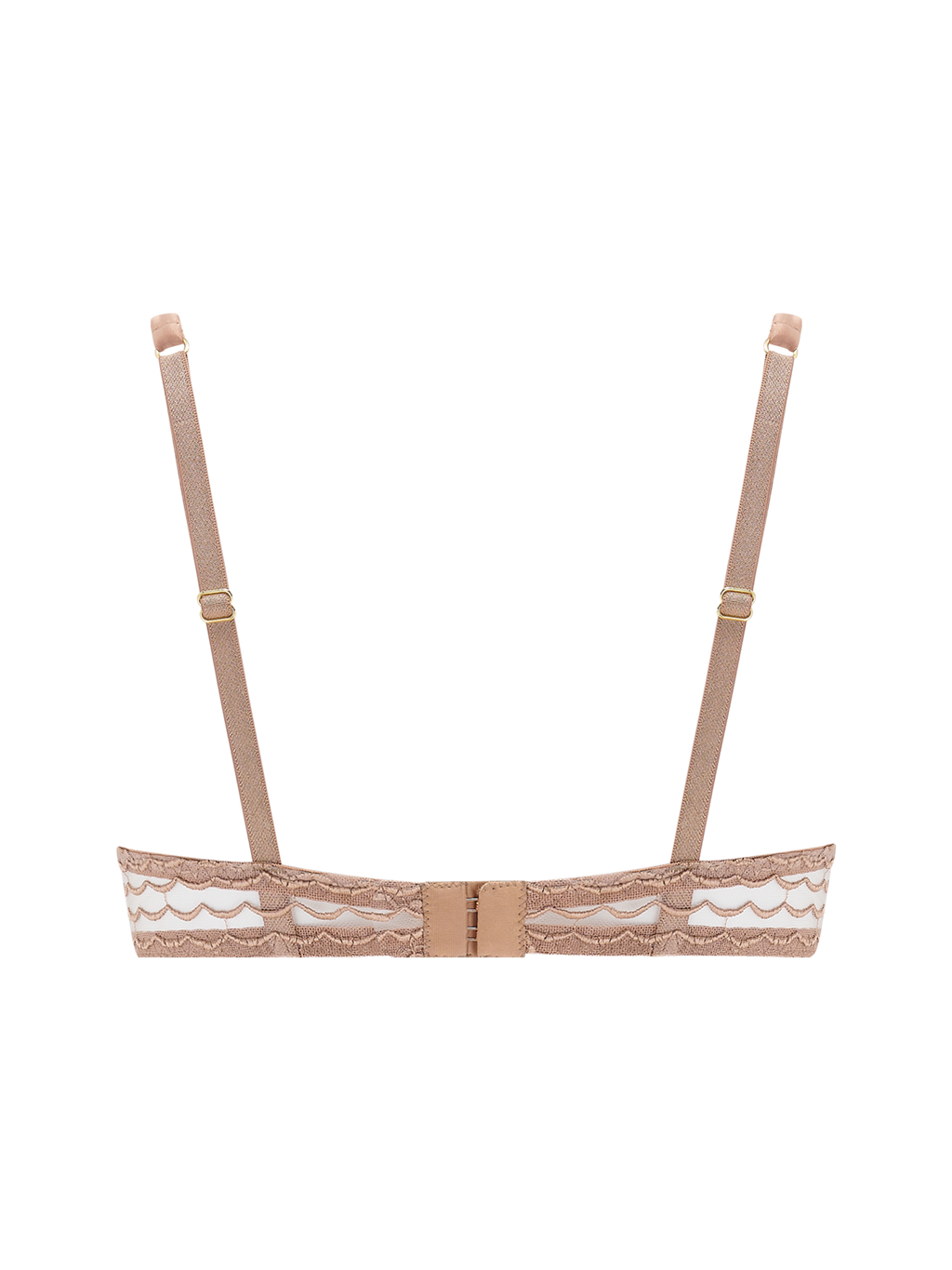 Sumptuous satin blends with waves of nude embroidery in a demi shaped cup with a wired structure, giving a gentle lift and a beautiful silhouette.