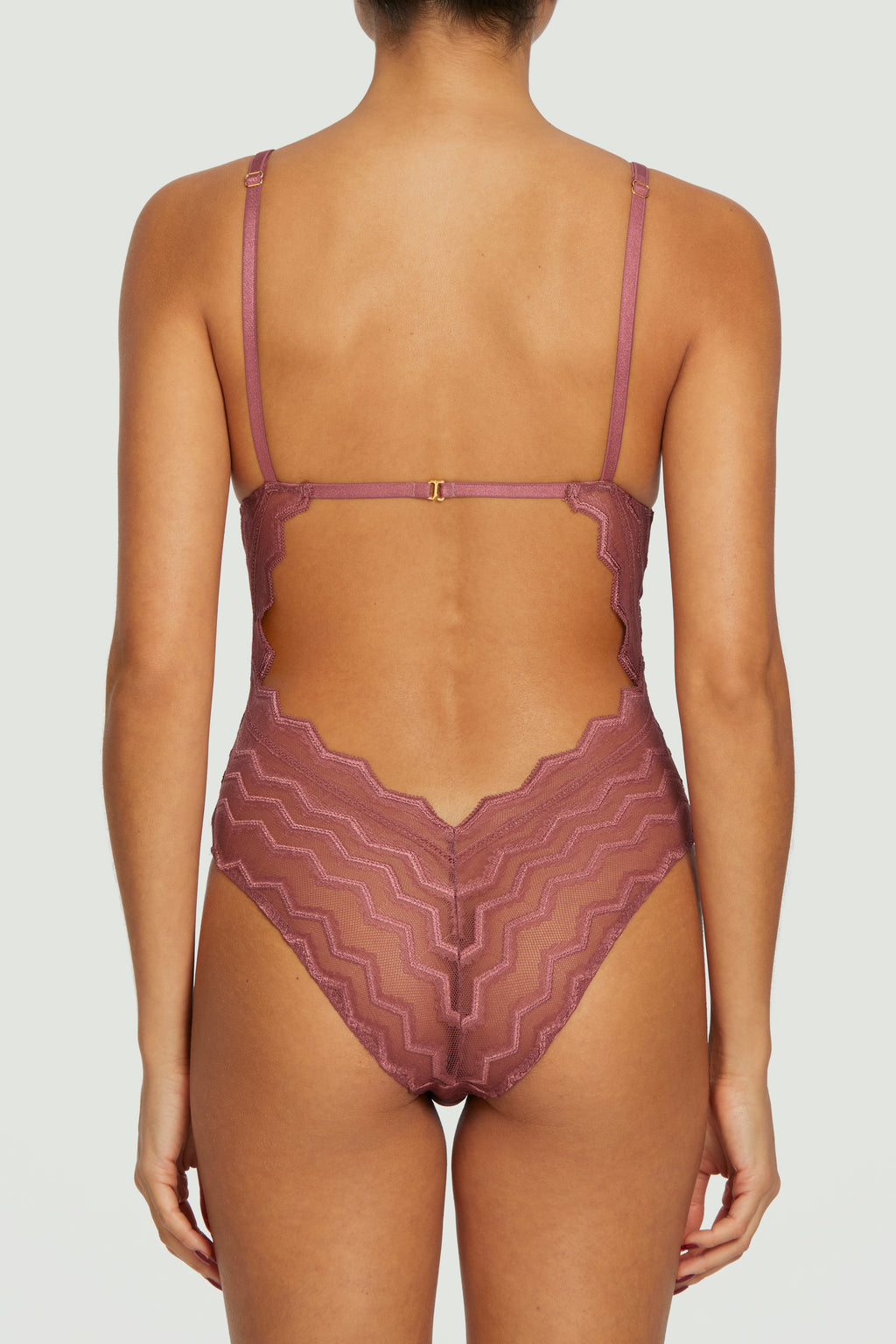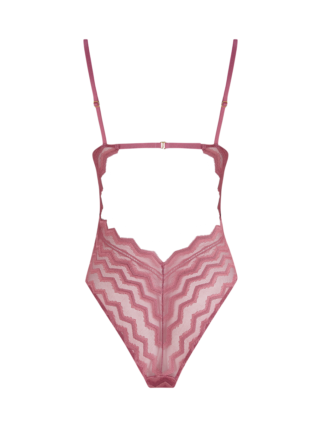 Captivating geometric stretch lace in a delicate rose hue creates a powerful sensuality. The clean neckline is set off by the wire-free shaping and the drama of the zigzag edging over the shoulders, with delicate and fully adjustable rose pink straps taking the eye down the shoulders. Playful cutouts at the front and back entice and empower. The positioning of the geometric lace lends a lift to your silhouette. One simple gold swan hook fastening at the back adds a finishing touch of gentle luxury.