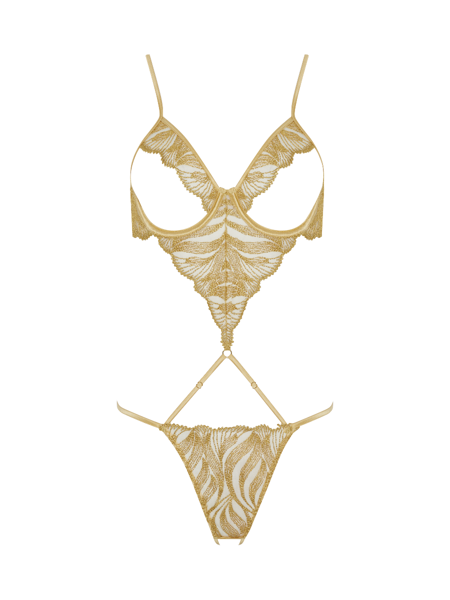 Gold embroidery panels cascade from the underwired open cups, creating a sculpted, elongating silhouette that draws the eye downward for tactile and visual indulgence.
